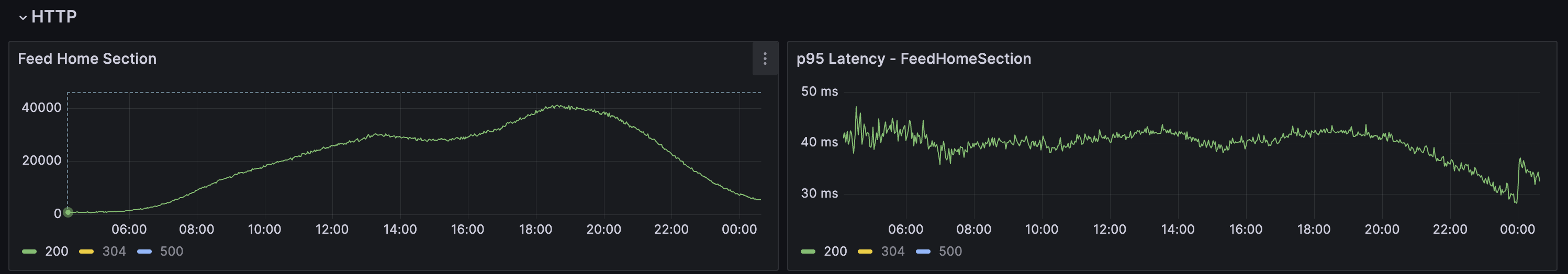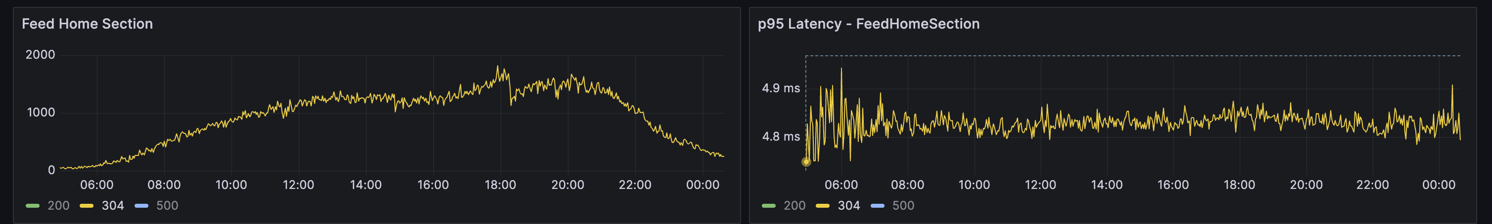 These metrics show 304 Not Modified responses, where the server validates the request using ETags and instructs the client to reuse its cached home feed. Since no re-rendering is required, this path avoids almost all computation, resulting in p95 latencies under ~5 ms. Additionally, because the client already has a cached response, the app can render the home feed almost instantly on startup. If any changes are detected, the feed is re-rendered making the overall experience feel significantly more responsive and snappy.